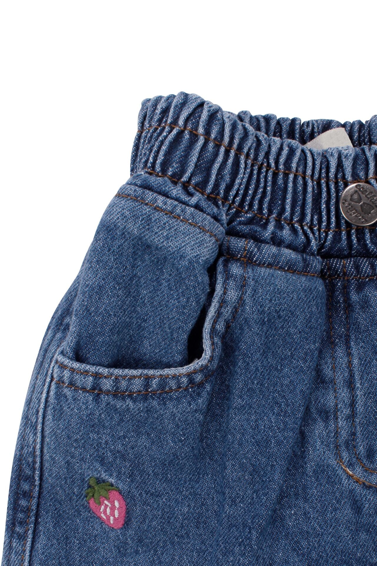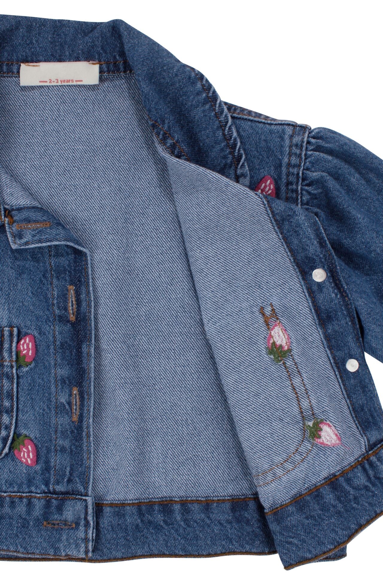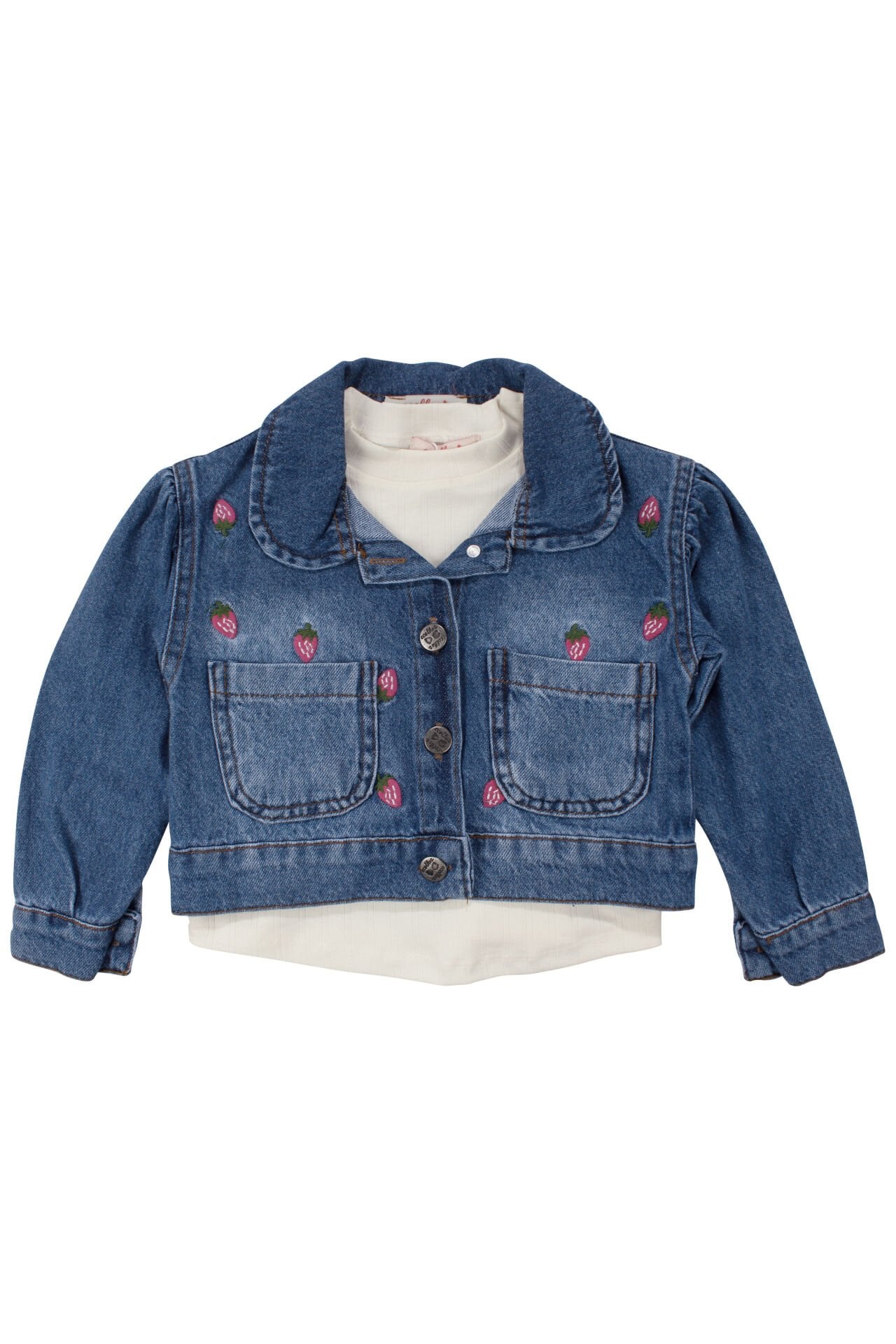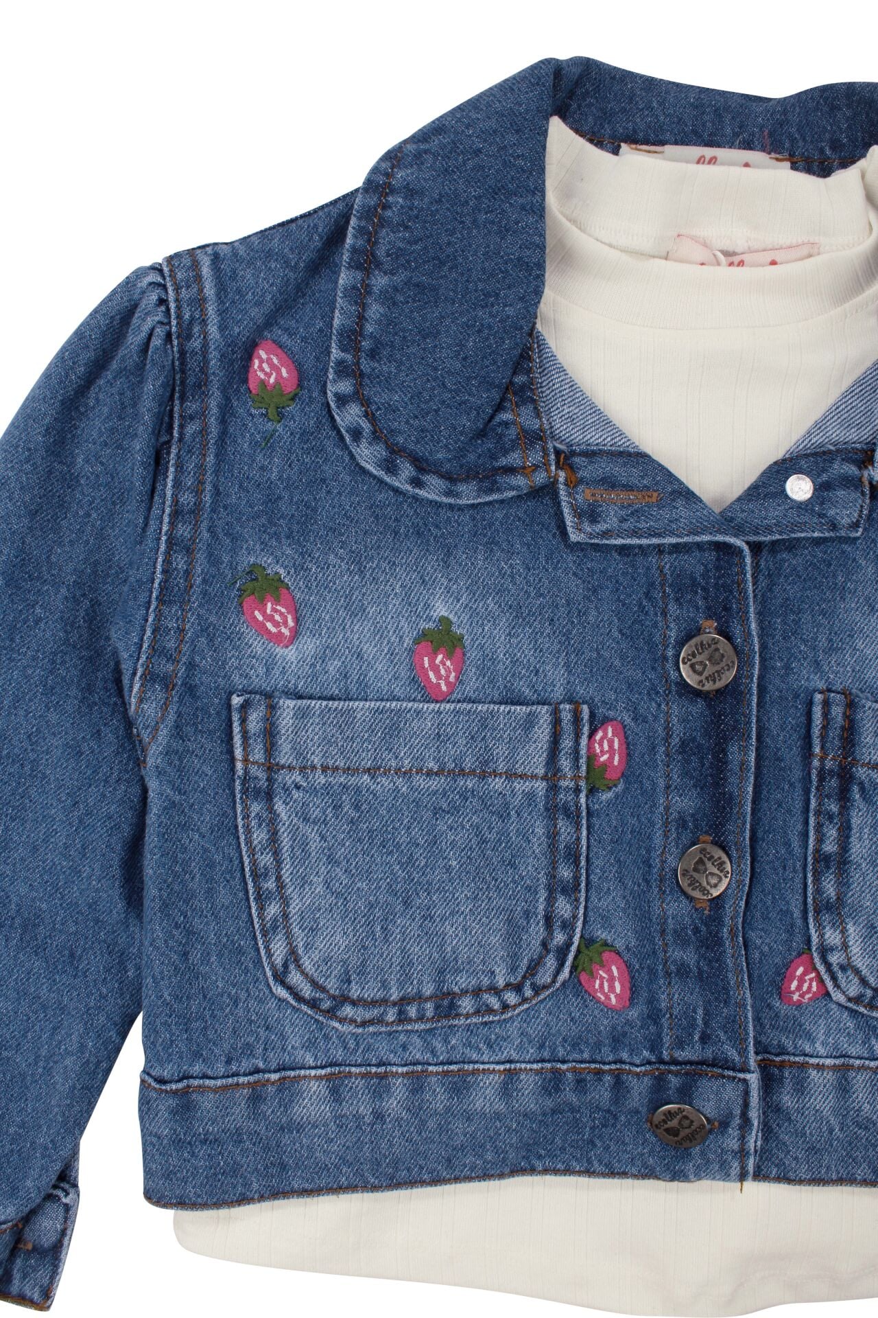 Kız Çocuk Ekru Badili Çilek Nakışlı Kot Ceketli 3'lü Takım
