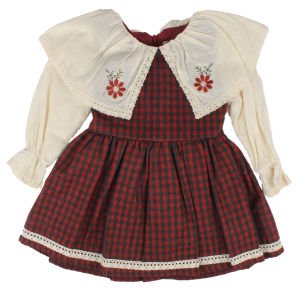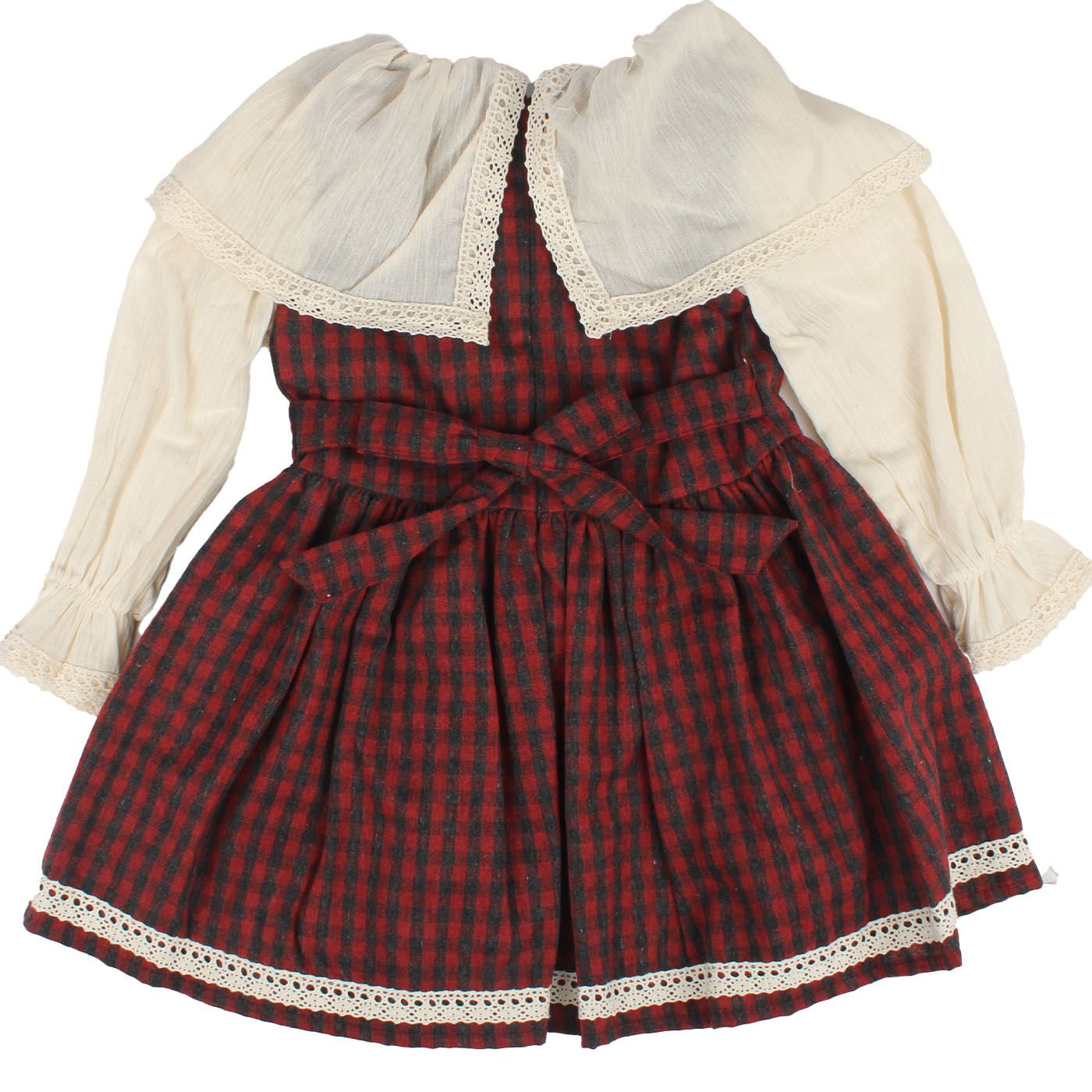 Kız Çocuk Ekru Kırmızı Ekose Desenli Yakalı Fistolu Çicek Nakışlı Elbise