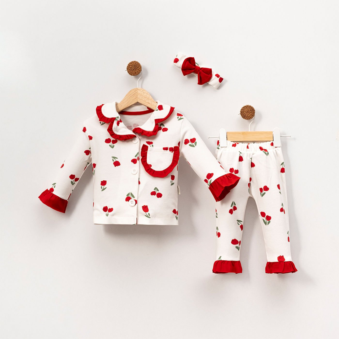 Kız Çocuk Ekru Kırmızı Lale Desenli Fırfırlı Bandanalı Pijama Takımı