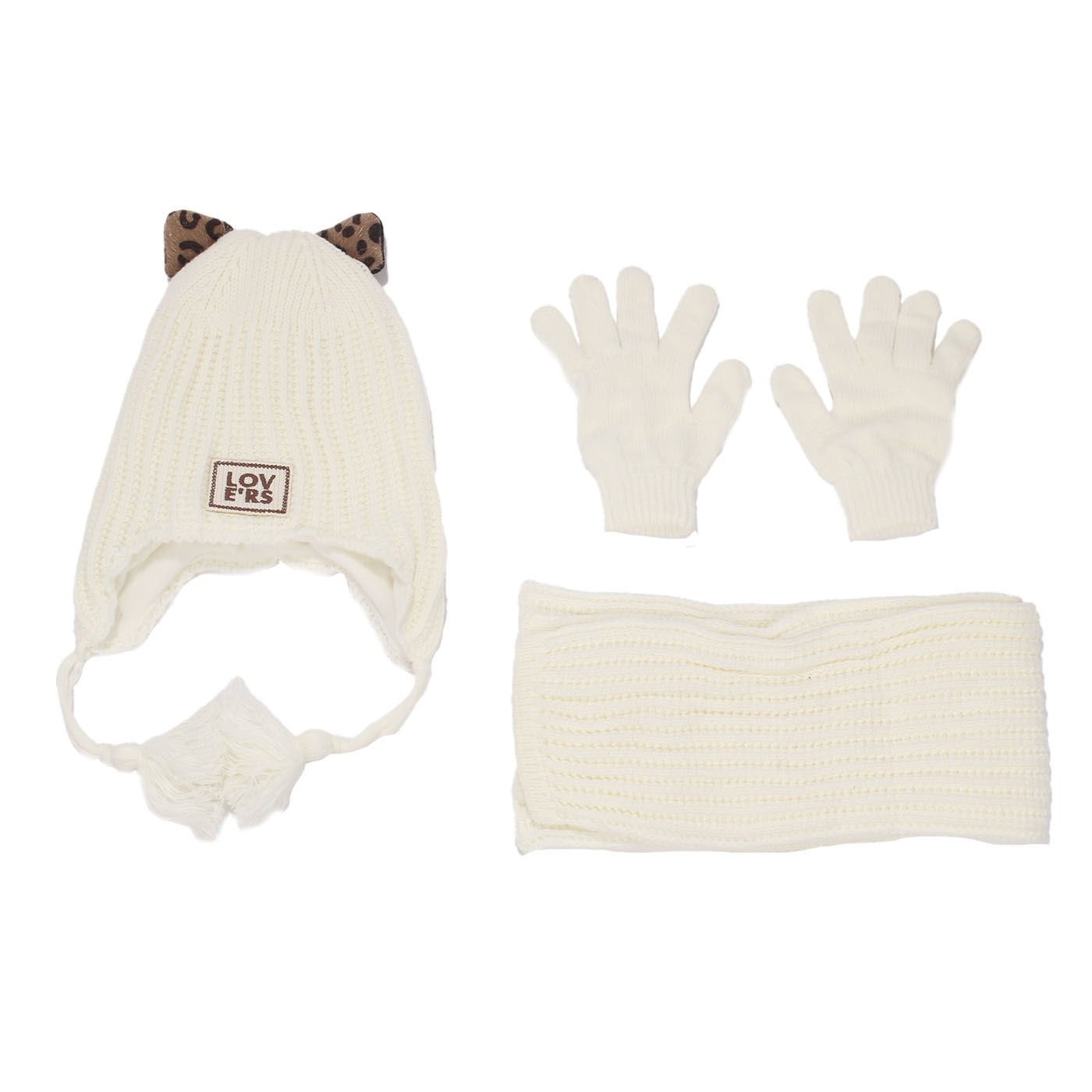 Kız Çocuk Ekru Leopar Kulaklı Lovers Yazılı Atkı Bere Takımı 4-8 Yaş