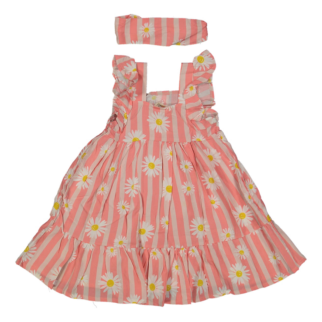 Kız Çocuk Fuşya Papatya Desenli Çizgili Elbise