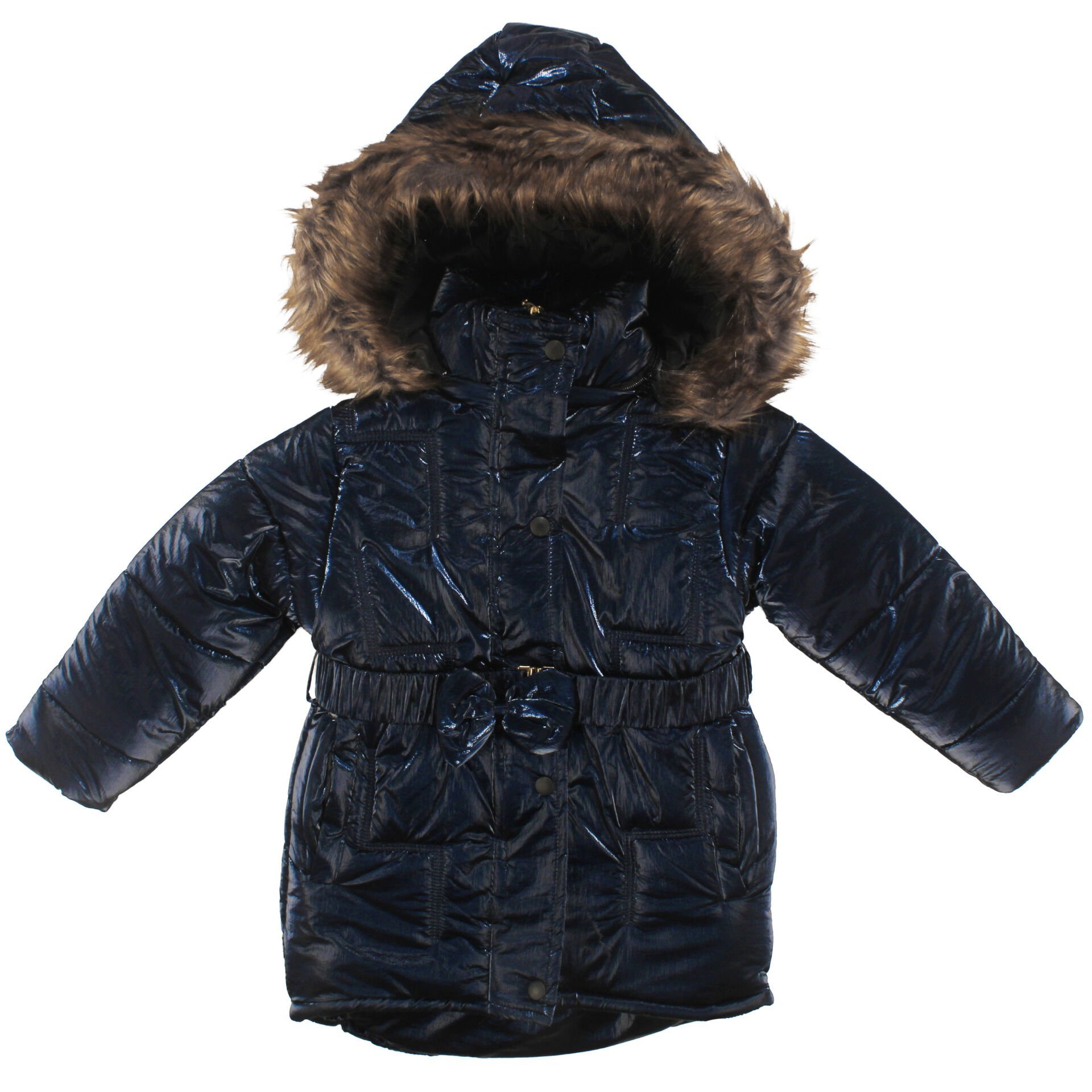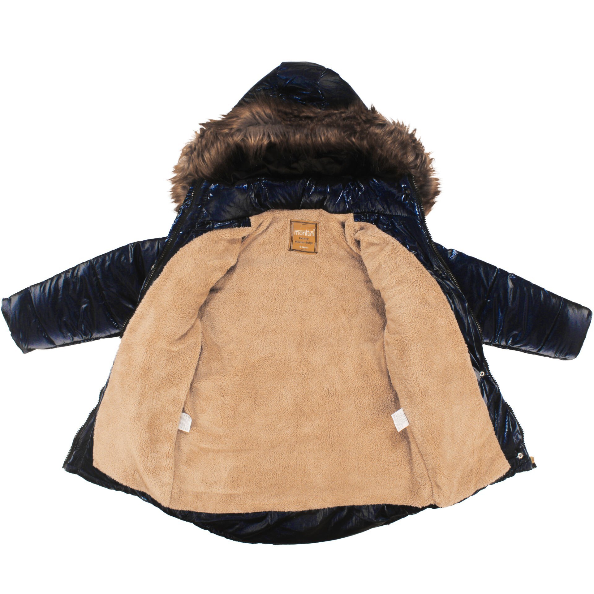 Kız Çocuk Lacivert Parlak Tüylü Şapkalı Kemerli Mont