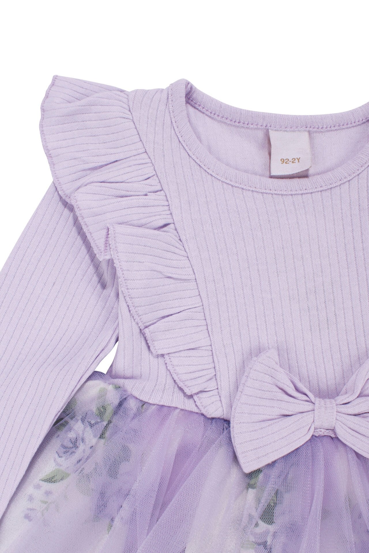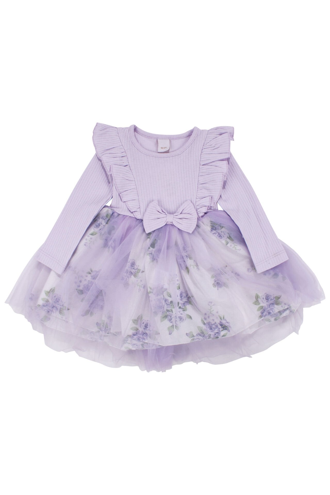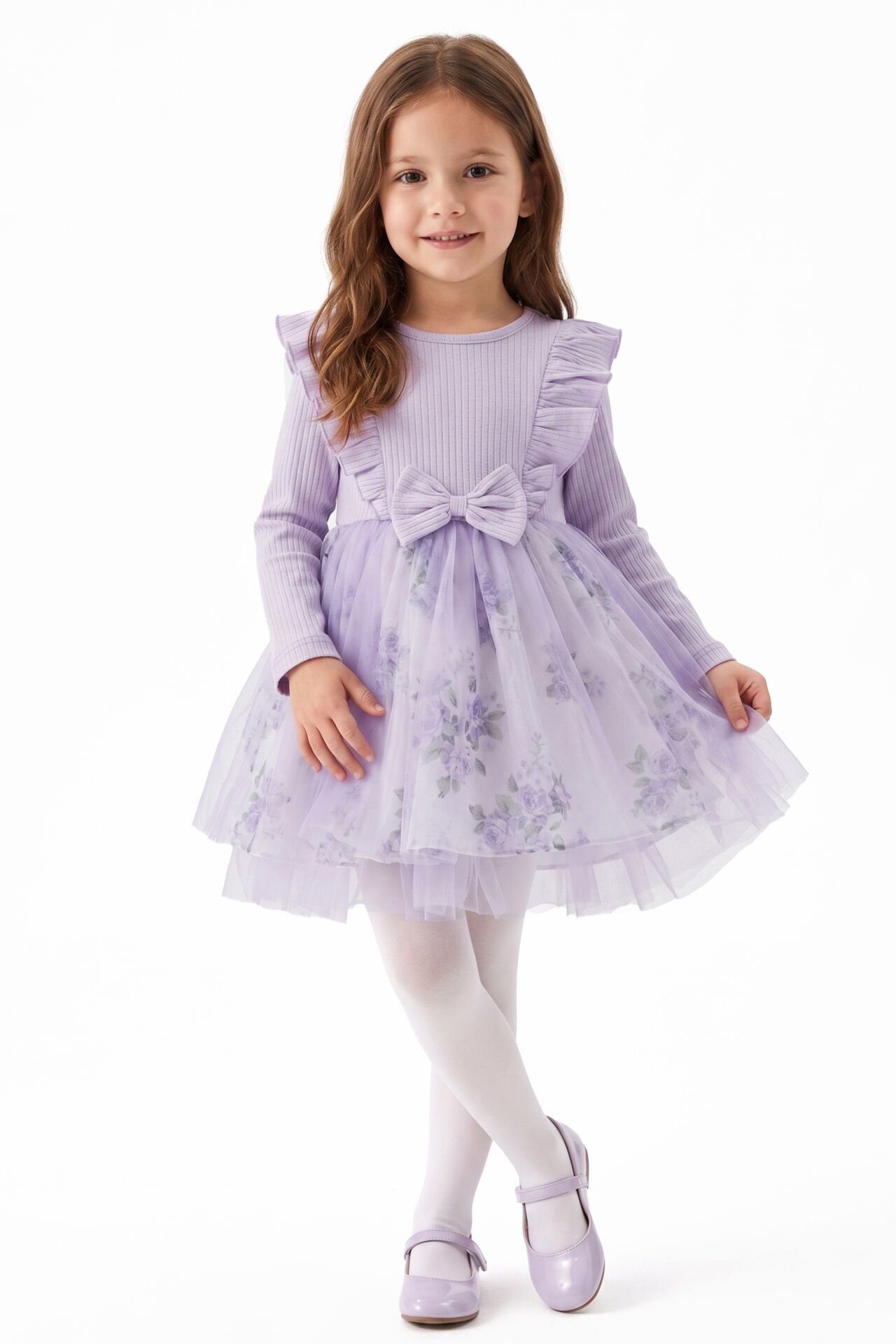 Kız Çocuk Lila Çiçek Desenli Tüllü Fitilli Fiyonklu Elbise