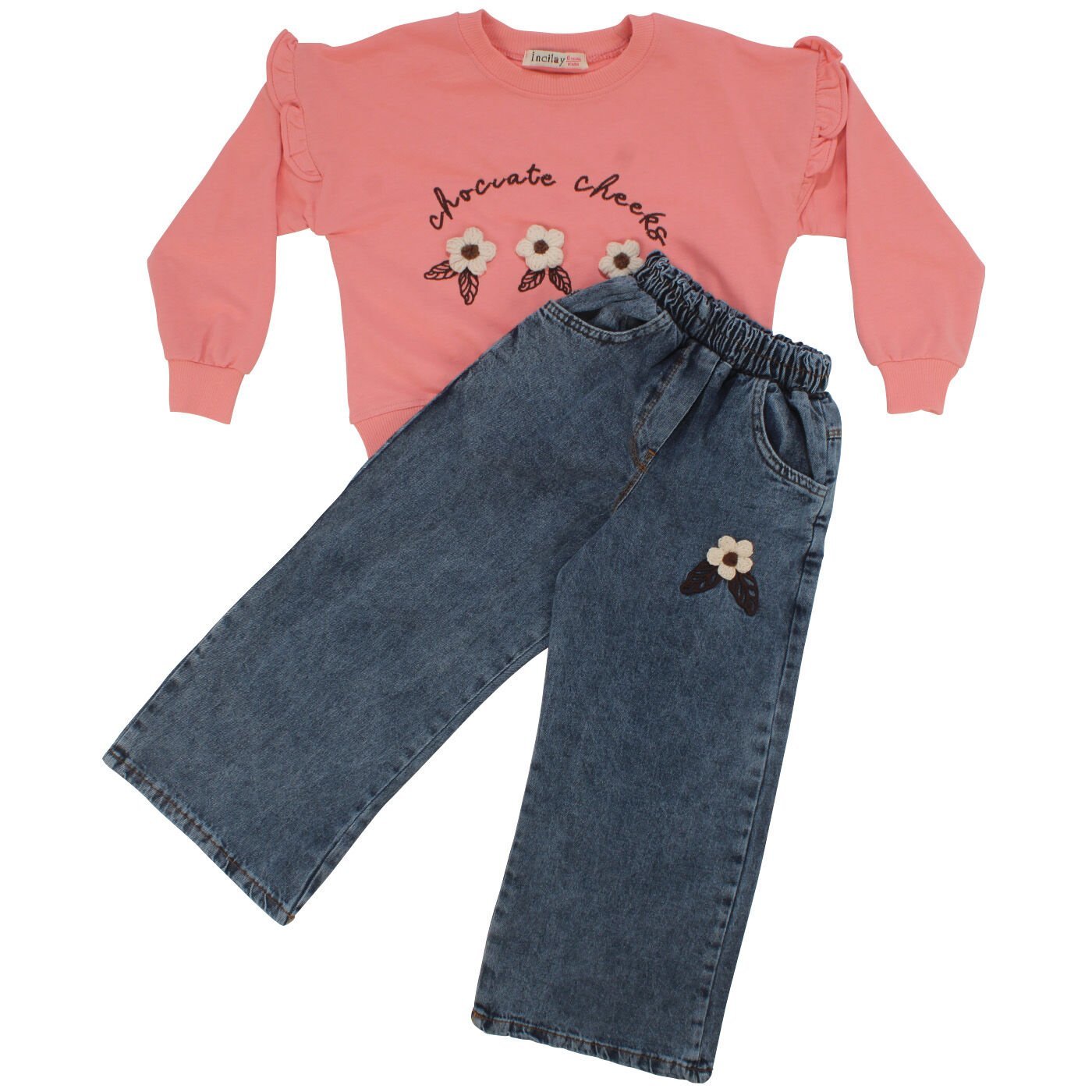Üst kısmındaki çiçek nakışı, takıma zarif ve tatlı bir detay katar. Alt kısmın kot pantolon detayı, modern ve kullanışlı bir tarz sunar. Pembe ve mavi renk kombinasyonu, minik kızların enerjisini ve neşesini yansıtan sevimli bir görünüm sağlar.
