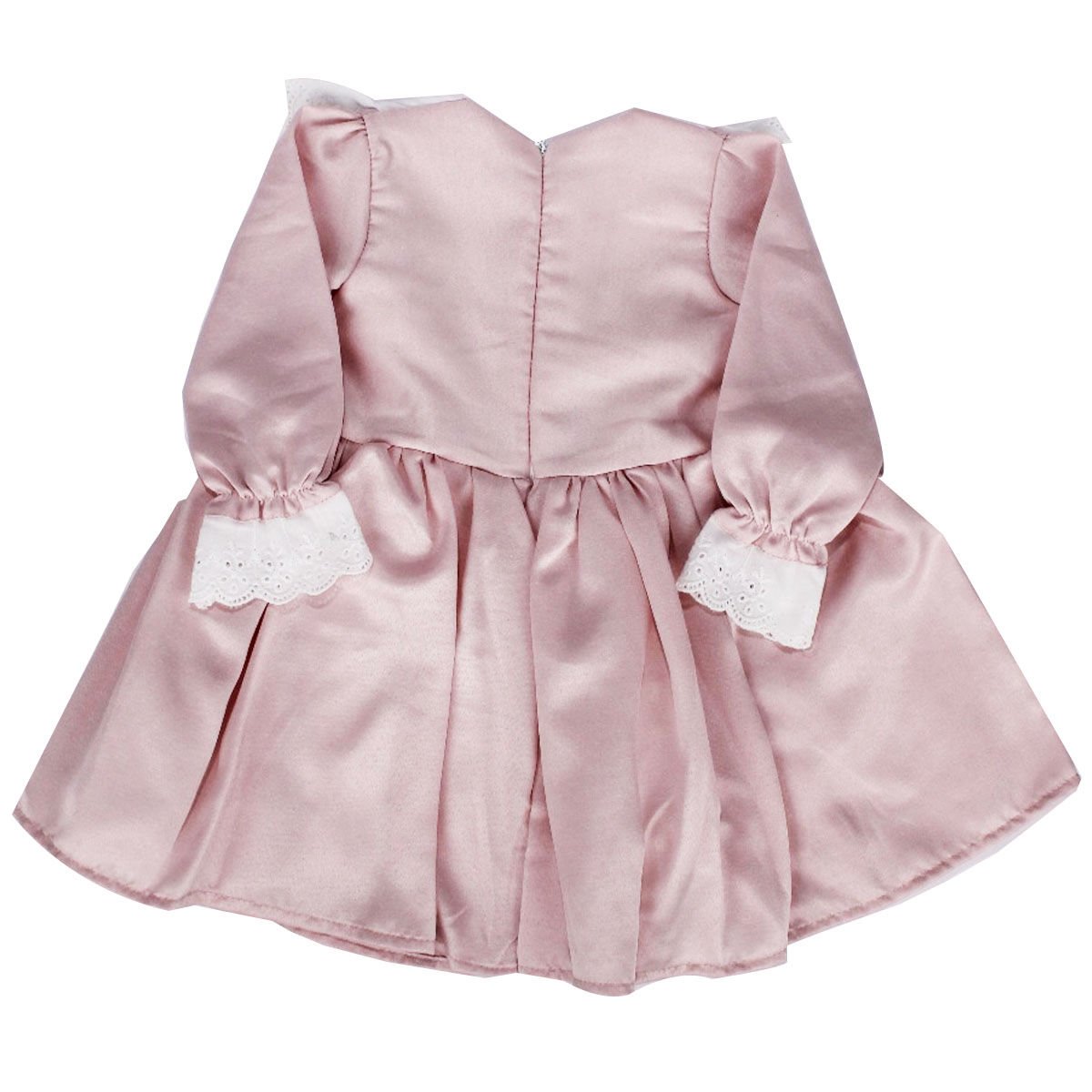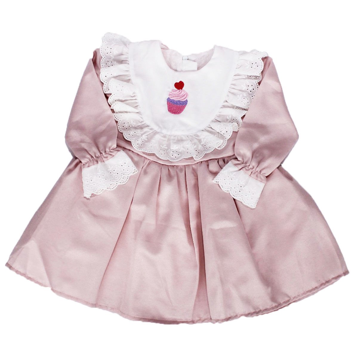 Kız Çocuk Pudra Ekru Fırfırlı Cupcake Nakışlı Uzun Kollu Elbise