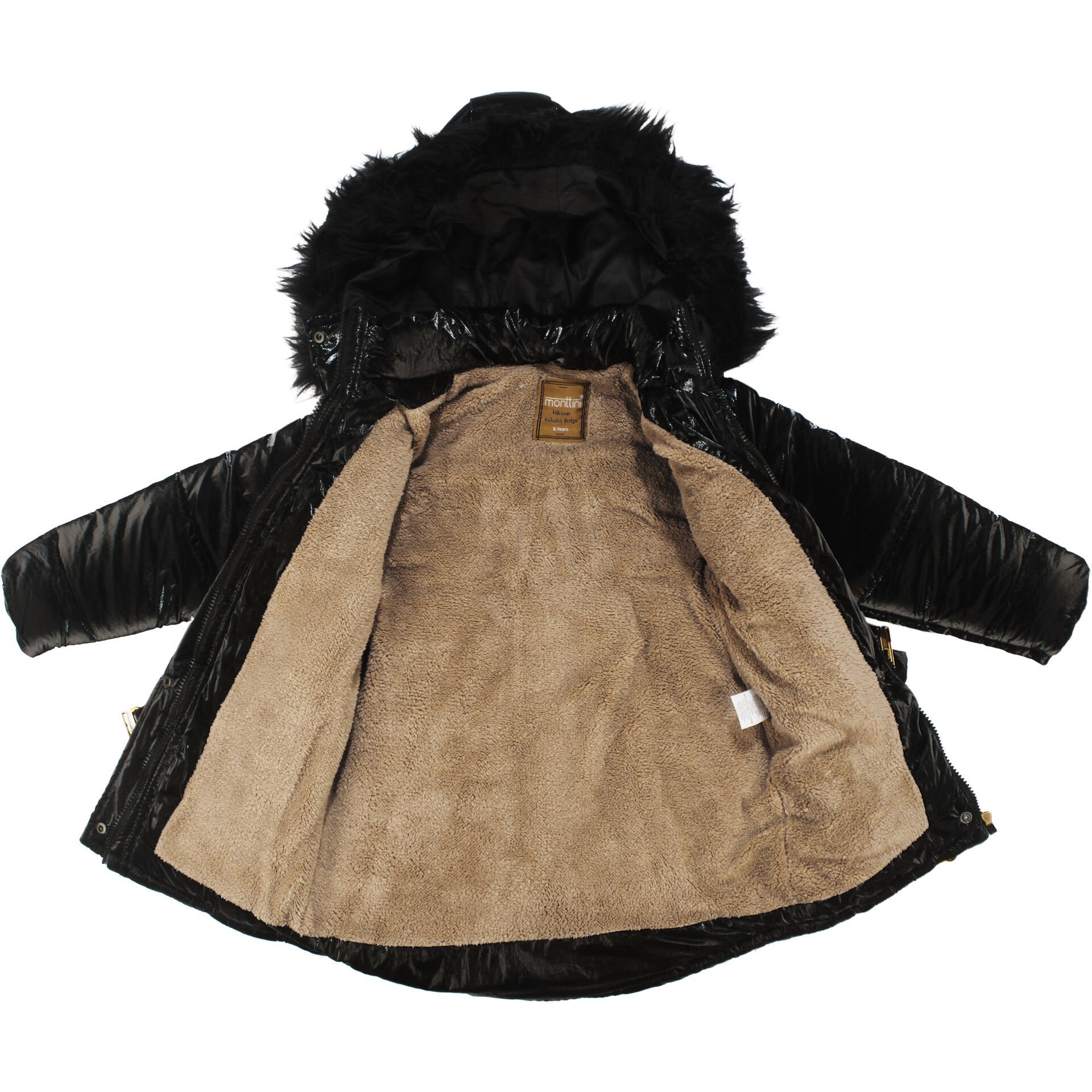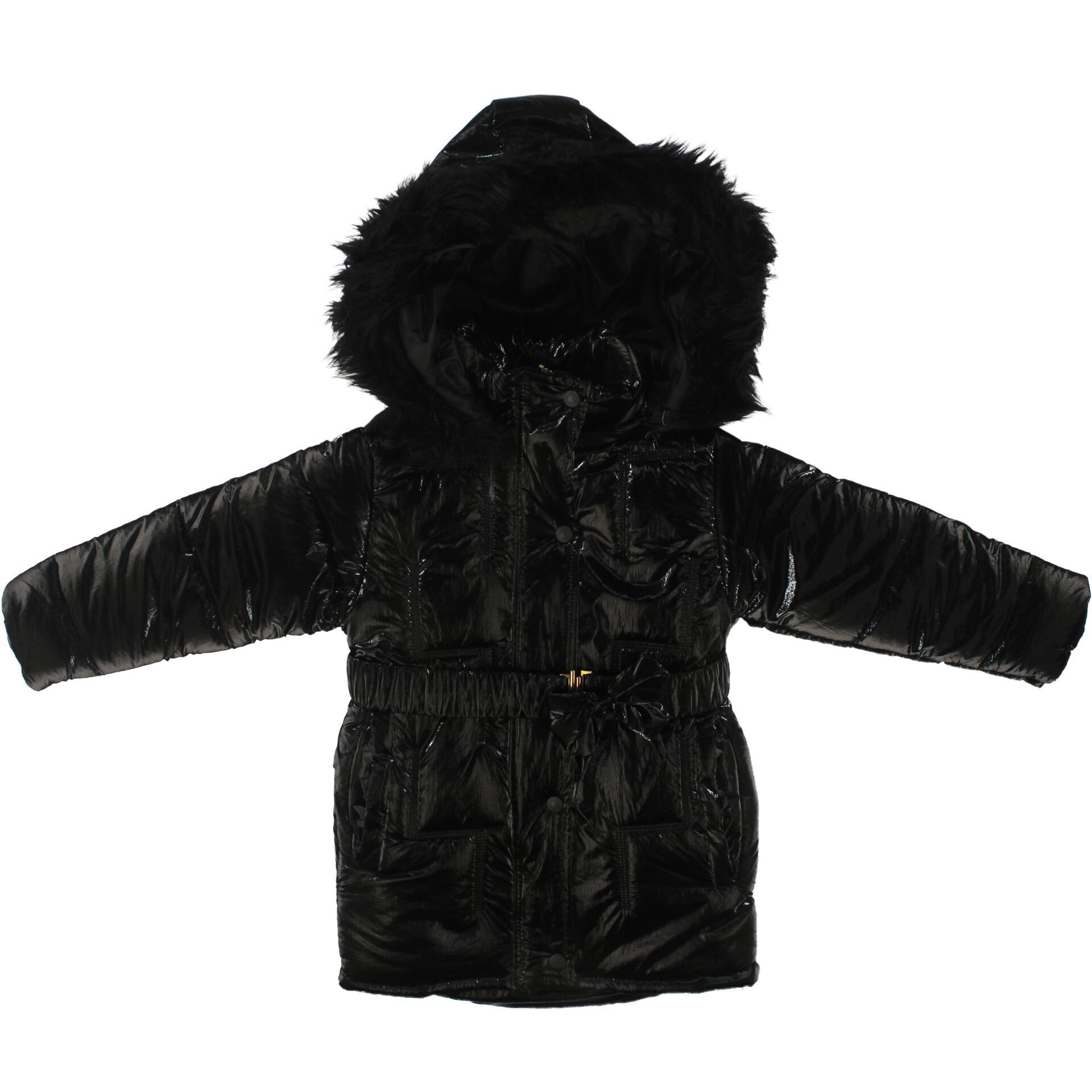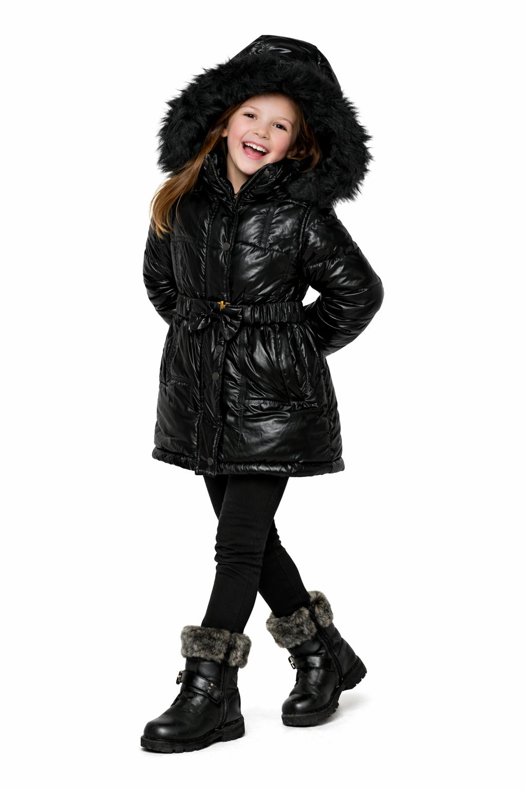 Kız Çocuk siyah Parlak Tüylü Şapkalı Kemerli Mont
