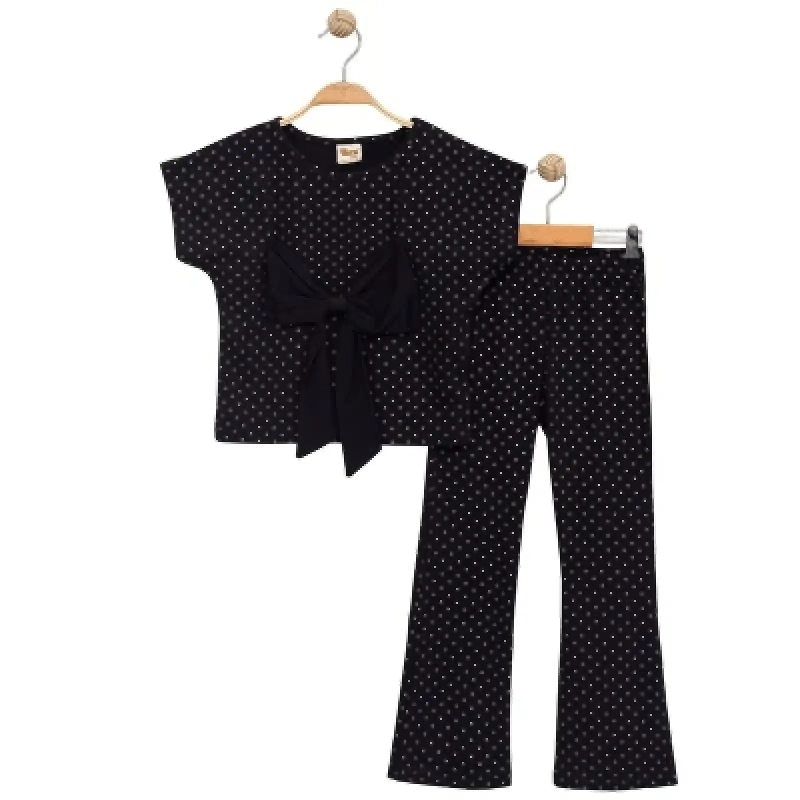 Zarif ve dikkat çekici detayları bir araya getiren bu 2’li takım, siyah rengin şıklığını simli puan desenleriyle tamamlar. Üzerindeki simli puanlı tasarım, ürüne ışıltılı ve hareketli bir görünüm kazandırırken; yer alan fiyonk detayı kombine sevimli ve şık bir dokunuş ekler.