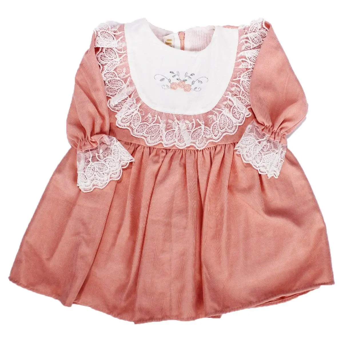 Kız Çocuk Somon Ekru Fırfırlı Gül Nakışlı Uzun Kollu Elbise