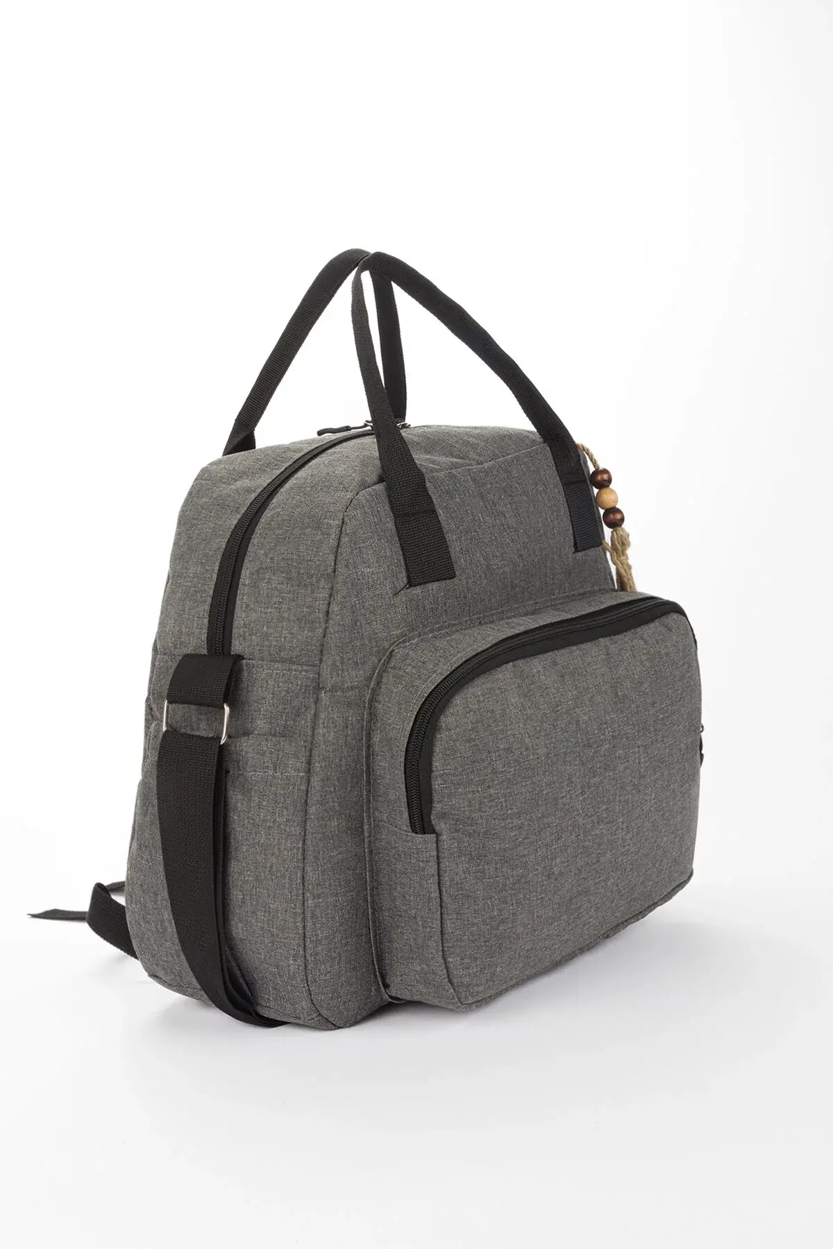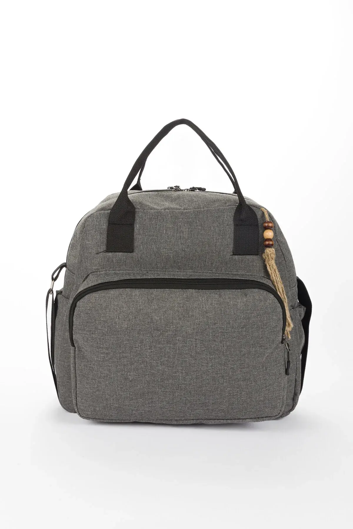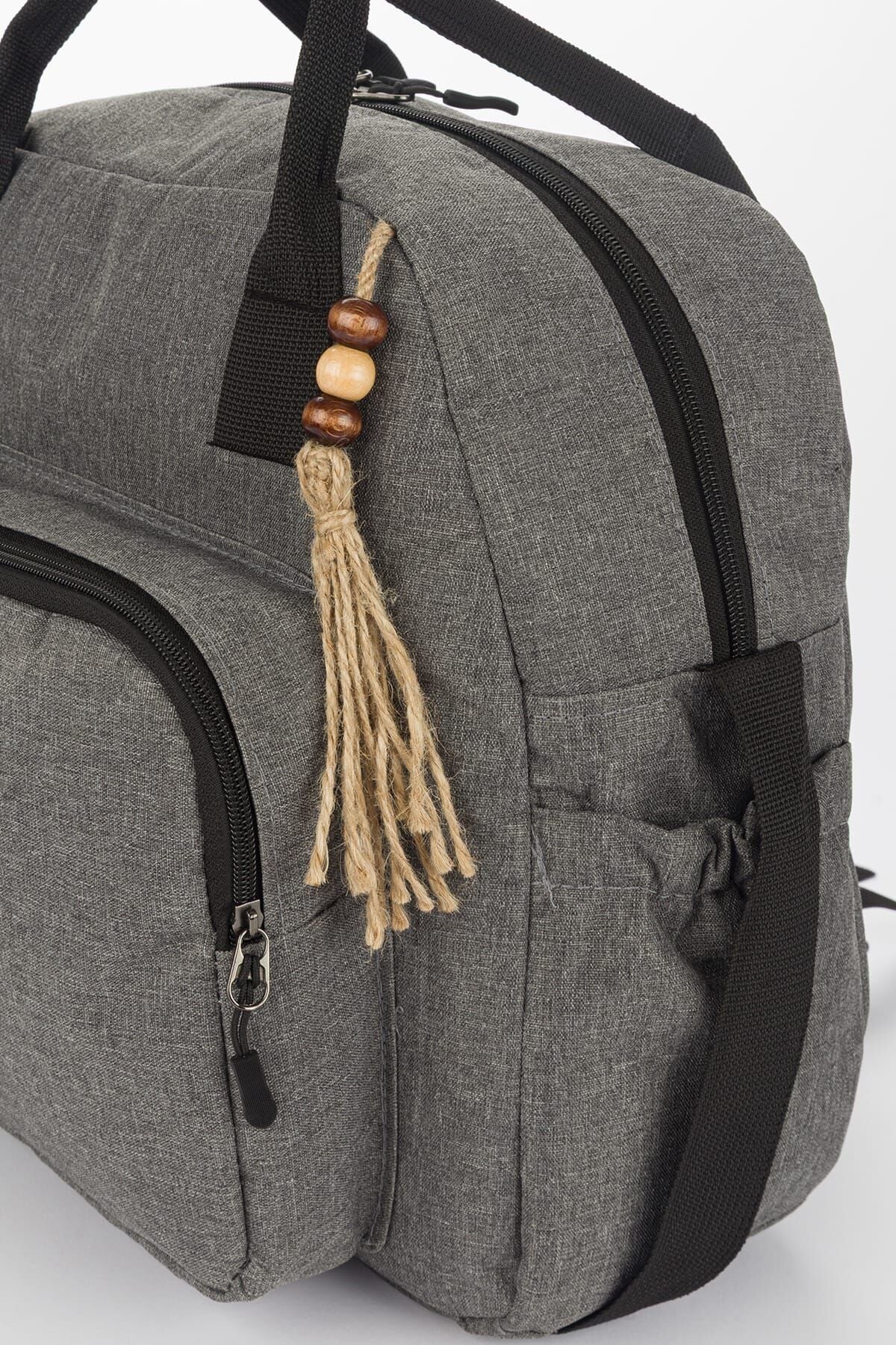 Lüks Gri Kahve Fermuarlı Cepli Hasır İp Aksesuarlı Anne Bebek Sırt Çantası