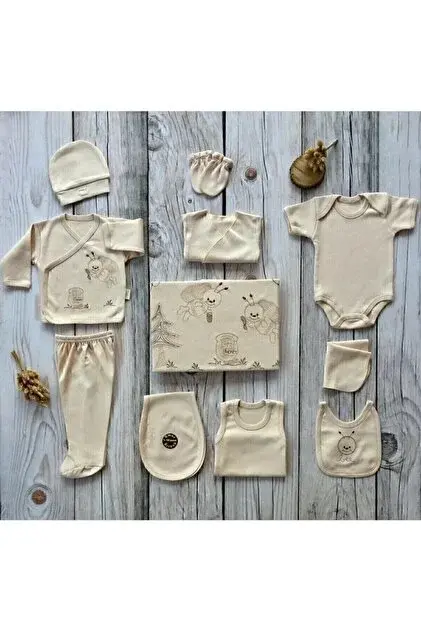 Yenidoğan bebekler için hazırlanan 11 parçalık hastane çıkış setidir. 0–4 ay aralığına uygundur ve %100 pamuk kumaştan üretilmiştir.