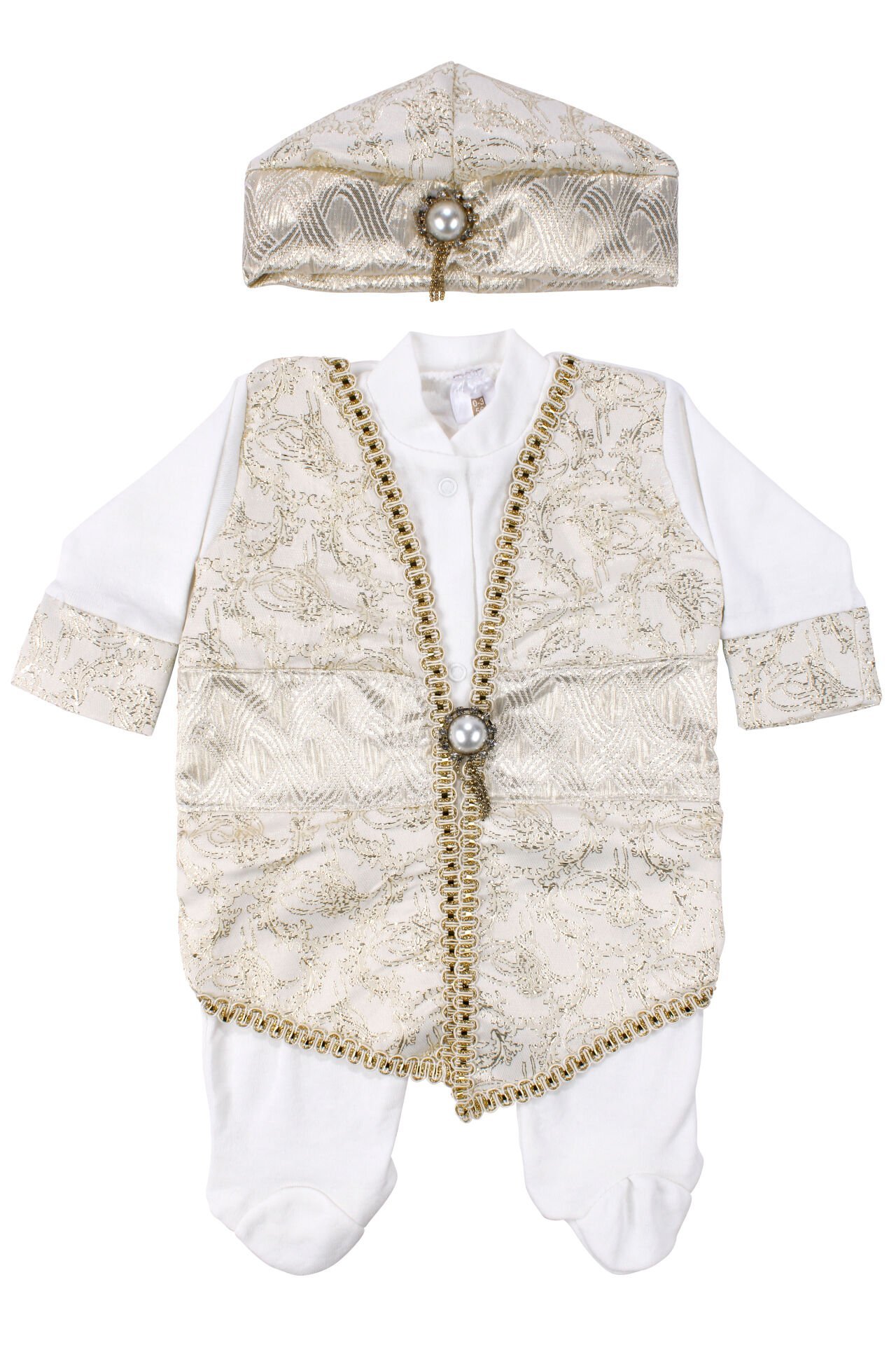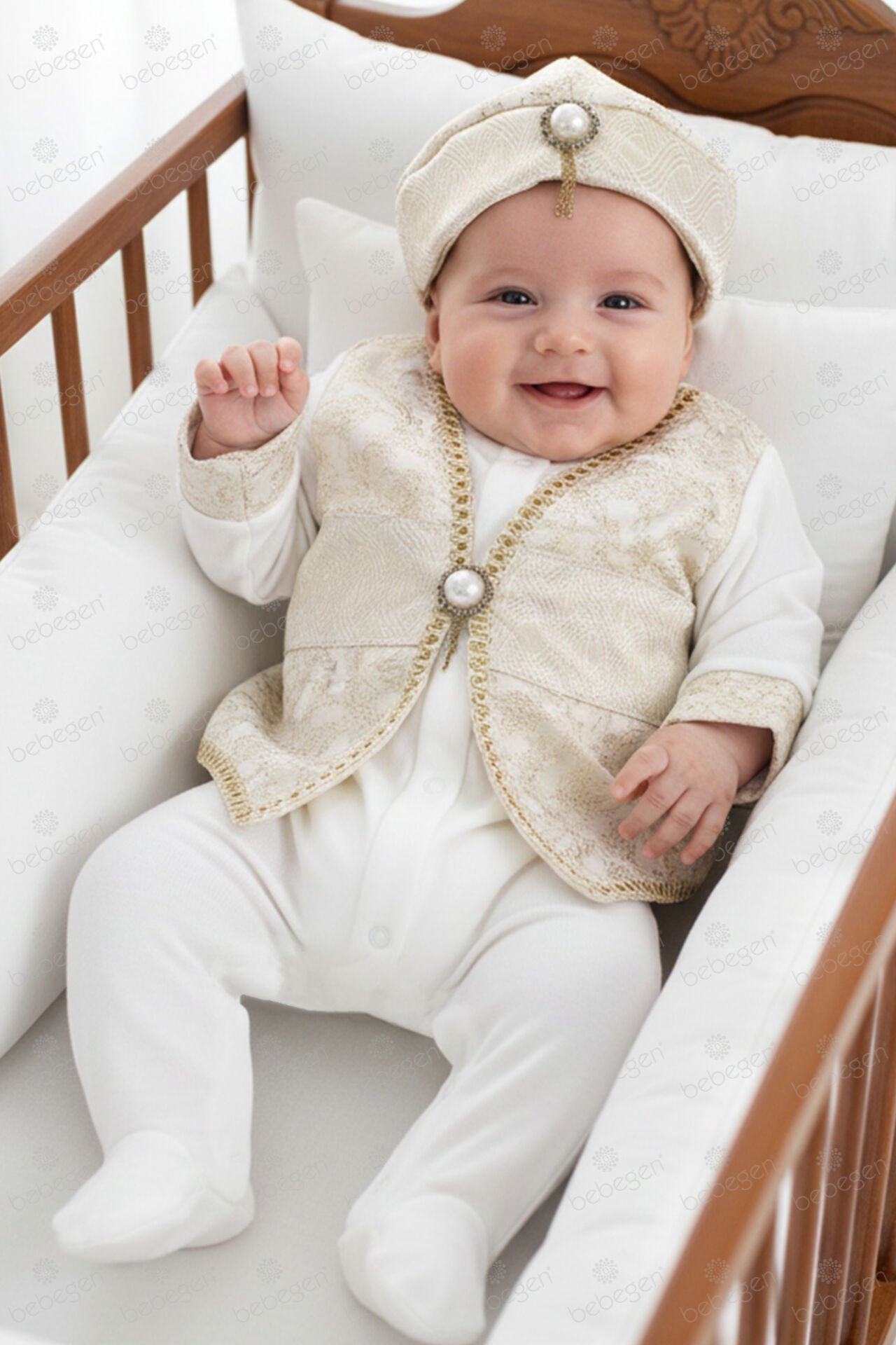 Tuğra Desenli Ekru Gold Şehzade Erkek Bebek Mevlüt Tulumu