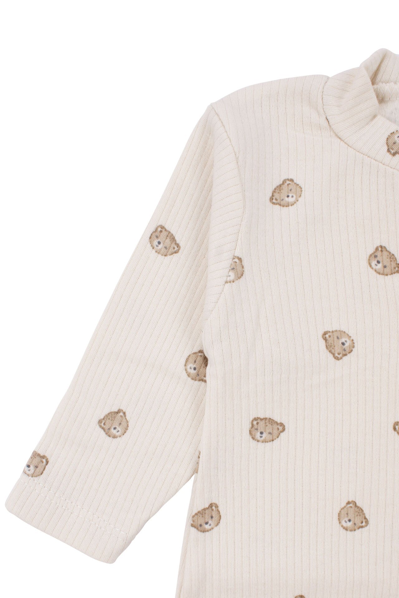 Rahatlığı ve sevimliliği bir arada sunan bu tulum, ekru zemin üzerine bej ayı desenli ve fitilli manşet detaylı tasarımı ile hem kız hem erkek bebeklerde sıcak, zarif ve eğlenceli bir görünüm sağlar. Fitilli manşetler, kolları ve bacakları nazikçe sararak ekstra sıcaklık ve konfor sunar. Alttan çıtçıtlı yapısı, kolay giydirme ve bez değiştirme imkânı sağlar; günlük bakım rutinlerini ebeveynler için çok daha pratik hâle getirir.