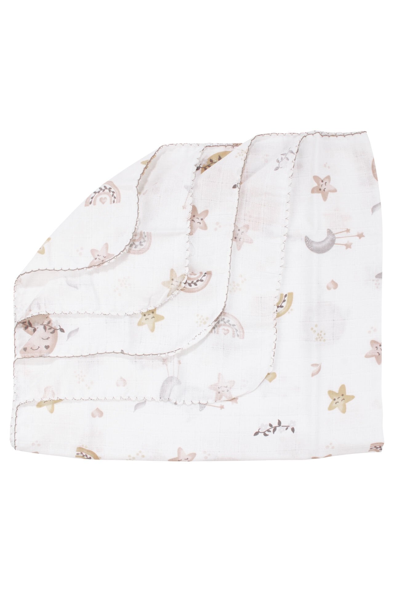 Unisex Ekru Sarı Yıldız Güneş Desenli Biyeli Tek Kat Müslin Battaniye