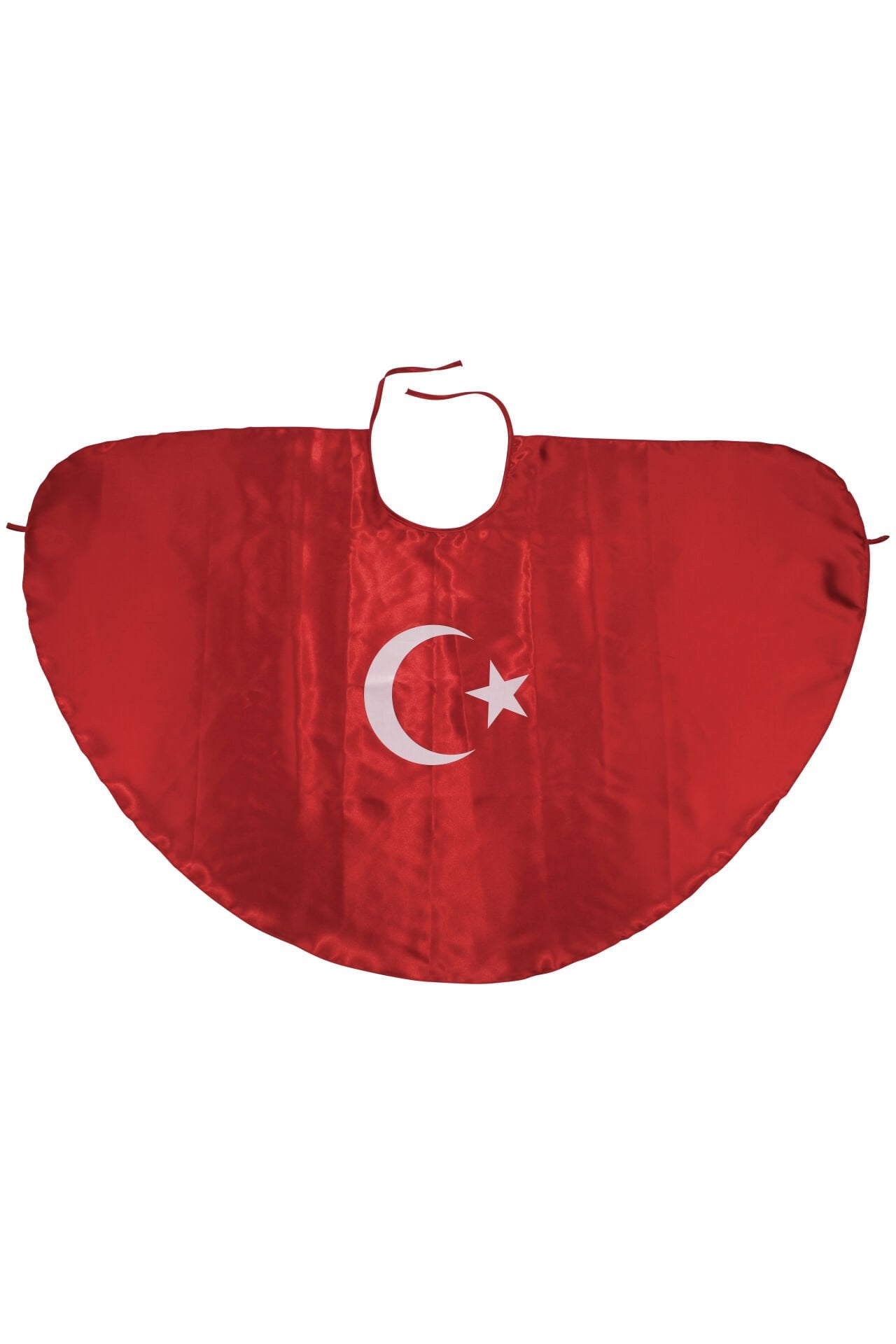 Milli temalı tasarımıyla öne çıkan bu pelerin, kırmızı zemin üzerine uygulanan ay yıldız baskı ile dikkat çekici bir görünüm sunar. Parlak saten kumaş yapısı, ürüne estetik ve akıcı bir duruş kazandırır.